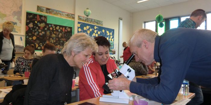 Behalve de 4 microscopen, kregen de leerkrachten een handout van de workshop en  werkbladen voor hun leerlingen  mee naar huis. Het was een dynamische, bruisende middag waarbij er een goede balans was tussen achtergrondinformatie en praktisch bezig zijn en waarbij de leerkrachten vol overgave kennis hebben gemaakt met de mogelijkheden van de microscoop .